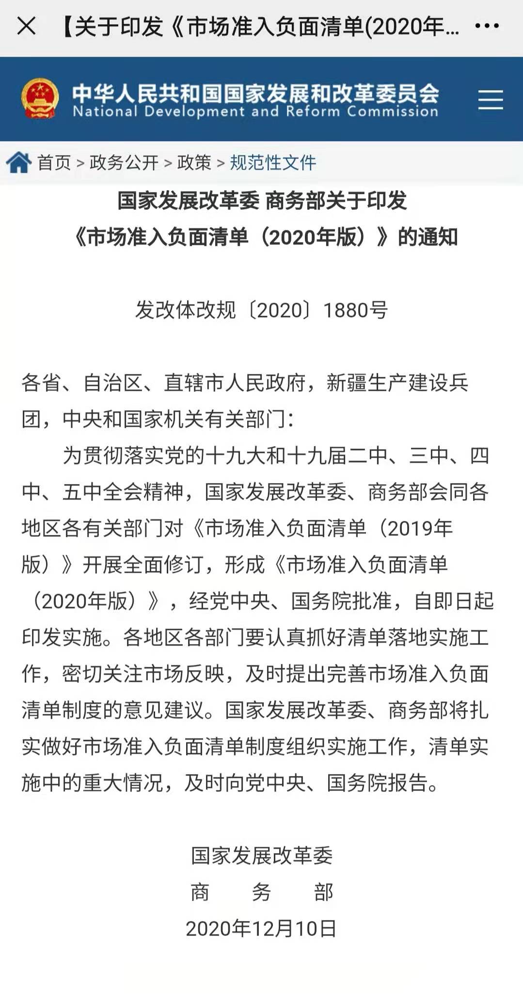 完整版《市場(chǎng)準(zhǔn)入負(fù)面清單(2020年版)》點(diǎn)擊https://www.ndrc.gov.cn/xxgk/zcfb/ghxwj/202012/t20201216_1252897.html閱讀原文